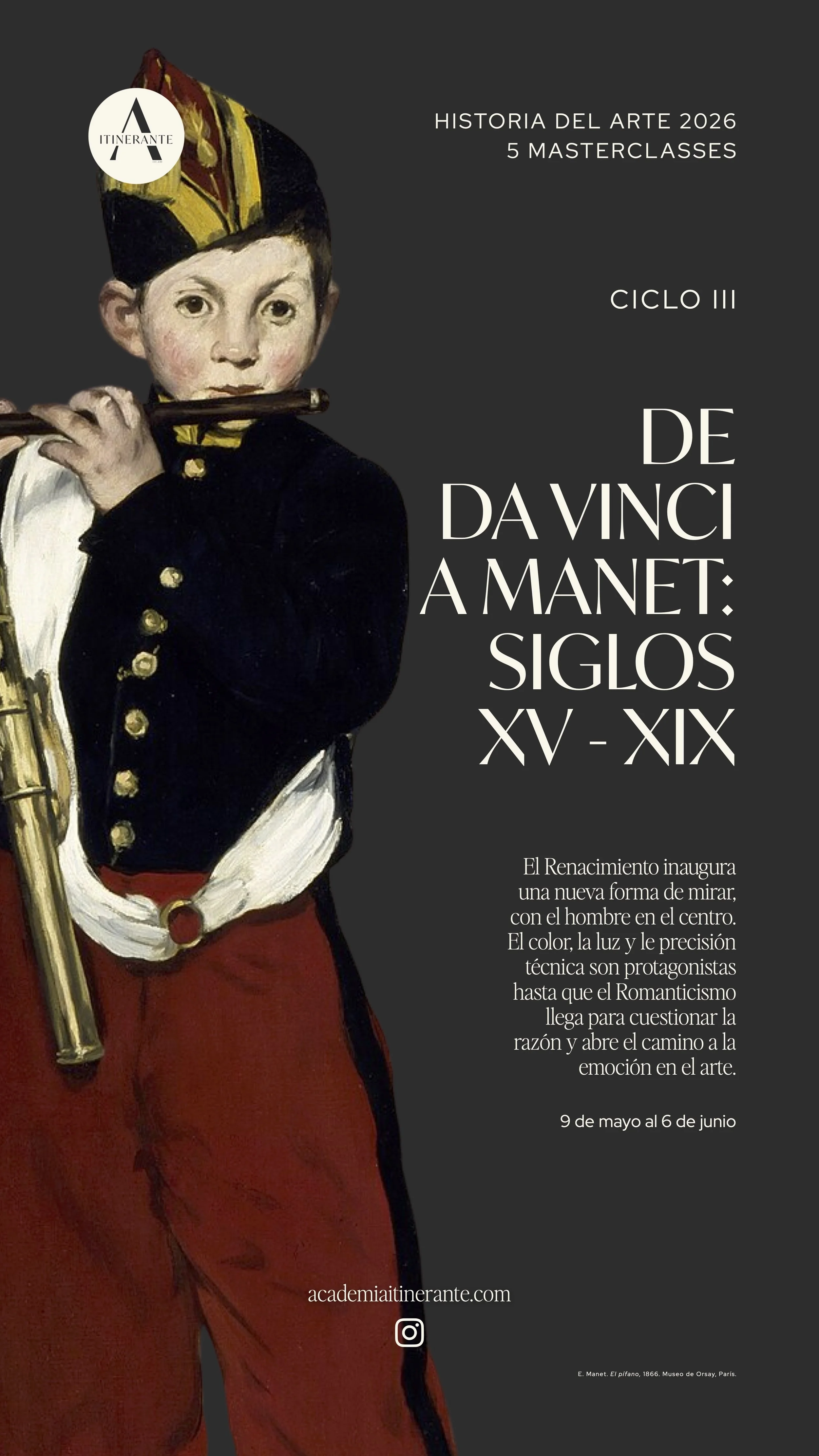 Los ciclos de formación en Academia Itinerante abordan biografías y momentos estelares de la historia del arte y la cultura. Su propósito es contagiar emoción y admiración: creemos que entender la vida de los artistas permite disfrutar aún más las grandes obras.
